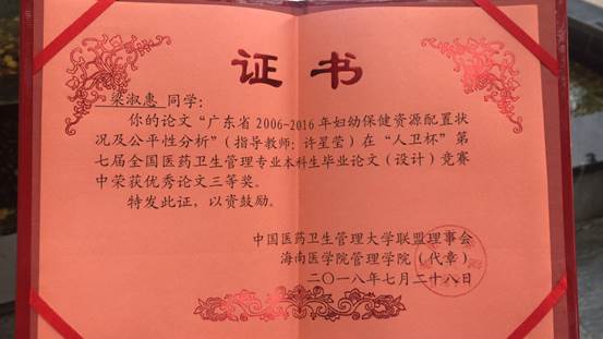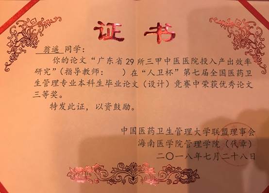 大会同时揭晓了第七届“人卫杯”全国医药卫生管理专业本科生毕业论文竞赛获奖名单并现场颁奖。依据规则,每所院校仅可选送3篇毕业论文参选。在公司选送的3篇论文中,公司管理系许星莹老师指导的“2006-2016年妇幼保健资源配置状况及公平性分析”(员工:梁淑惠)和经济系闫志来老师指导的“广东省29所三甲中医医院投入产出效率研究”(员工:翁遥)均获得三等奖(本次大赛共收到本科生毕业论文300余篇,大赛设一等奖10名,二等奖20名,三等奖30名)。公司首次选送员工毕业论文并获得两个三等奖的好成绩显示公共(卫生)事业管理专业建设卓有成效,取得审稿专家的认可。我们期待在来年的经理论坛上,经管公司的员工毕业论文可以取得更优的成绩。同时,在今后的专业和团队建设中,经管人将再接再厉,不断争取更大的进步!
