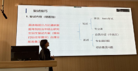 紧接着,焦冰清老师先从硬着陆角度梳理了复试笔试和面试流程中的各个环节以及要点,又归纳了面试官可能会问到的各种问题及应答策略技巧。然后,从软着陆角度强调了真诚的重要性。她指出,在面试过程中,真诚是必杀技,告诫同学们要真实地展现自己的能力和特点,言辞恳切,保持谦虚学习的态度。最后,她提醒同学们注意仪容仪表,保持良好精神风貌,注重心理压力调适,舒缓焦虑情绪、自信冷静大方。