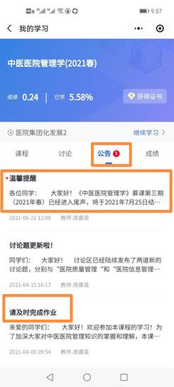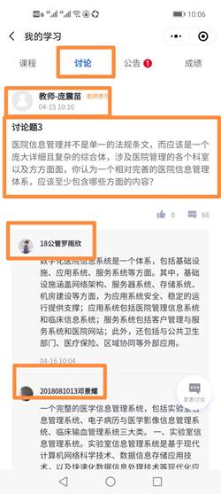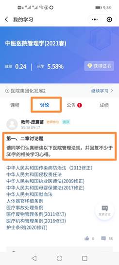下面介绍线上部分的课程设置,线上课程基本的模式是,(1)课前布置章节作业,(2)课后组织线上讨论,(3)每章有作业要及时完成,(4)课程有专门的思政育人讨论,(5)全部完成要参加线上期末考,由研究生助教登记作业情况和参与讨论情况。线上部分学习,要求员工都是实名制,后台也会根据员工听课时长、交作业和参与讨论发言情况,自动生成考评成绩。比如,在《医疗质量管理》这一章,主讲老师程兰教授是在该领域非常有经验的一位省中医资深专家,同学们通过收听程兰老师的慕课就可获益良多了,在课前我们还布置了作业和讨论题——请同学们在中国知网上,利用关键词(如医院质量管理)检索,整理研读资料,并回答:医疗质量管理并不是单一的法规条文,而应该是一个庞大详细且复杂的综合体,涉及医疗管理的各个科室以及方方面面,你认为一个相对完善的医疗质量管理体系,应该至少包含哪些方面的内容?慕课当天课前布置,要求慕课当天提交,由助教统计参与情况,并在第二天公布参考答案。引导员工积极思考。另外,结合时事热点,我们也将医院管理相关话题发布在讨论区内,启发同学们的思考,比如《最新榜单:2020中医医院百强》《全球最大医院门诊爆棚,堪比春运现场》《国务院出台最严令,18条医疗红线医护不能碰》……老师和助教随时观察讨论区和留言板留言,对员工遇到的疑惑随时作答。